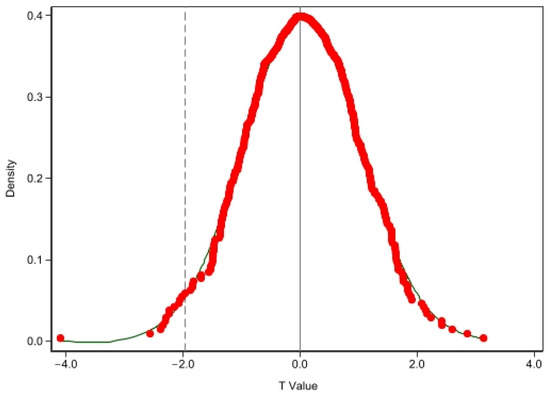 The placebo test in this study aimed to discern whether the observed enhancement in UCEE, attributed to the establishment of EIPs, could be ascribed to random factors or other unobserved policy effects. Following the methodologies outlined by Qian et al. (2021) [63] and Li et al. (2022) [64], the study randomly reassigned the treatment indicator DID within the sample and then redistributed this indicator to each sample. Subsequently, the DID model was re-estimated using the shuffled treatment indicator 500 times. The estimation results of the placebo test are presented in Figure 4 The figure indicates that the T-values of the random samples are predominantly centered around 0, with the majority of estimated p-values exceeding 0.1, thus demonstrating a normal distribution. Consequently, the findings of this study are deemed robust.