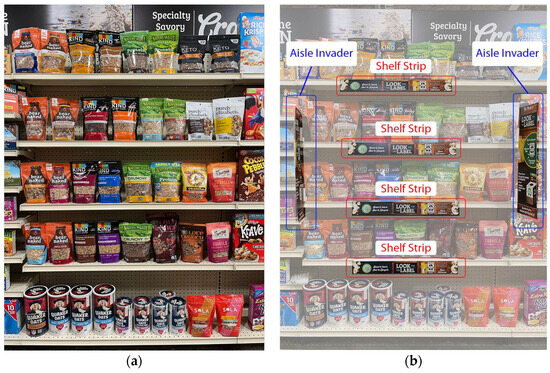 In the granola aisle, Group A conducted their shopping experience devoid of any in-store signage (Figure 1a), while Group B navigated the aisle in the presence of designated in-store signage (Figure 1b), including shelf strips and aisle invaders. Each participant received an identical shopping list and was instructed to proceed with their shopping in their customary manner. A store drop-off bin was placed at the entrance of the retail laboratory for both groups during the entire experiment.