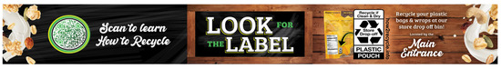 The shelf strips measured approximately 3 inches in width and 24 inches in length, printing on one side only. The aisle invaders measured approximately 6 inches in width and 24 inches in length, with printing on both sides. Their graphic design consisted of four main elements, including: (a) a QR code that could be scanned to access recycling information for the plastic store drop-off pouches; (b) a message urging people to check for the label, an image of the backside of the product pouch along with recycling instructions; (c) a call to action encouraging individuals to recycle plastic bags and wraps at the store’s drop-off bin near the main entrance; (d) visuals of breakfast granola in order to blend in the overall theme of the tested granola planogram.