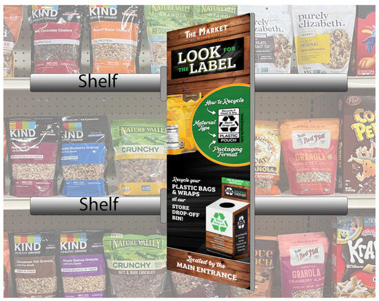 This study concluded that consumer awareness of How2Recycle labels and the usage of store drop-off bins could be elevated through strategically positioned in-store signage, especially via messaging on shelf strips. There was strong evidence that consumer education plays a critical role in raising consumer awareness of the recyclability of plastic bags and wraps, as does the existence of store drop-off bins. In this research, consumer awareness of the store drop-off program and its recycled content claim showed a significant increase (p < 0.05) after exposure to in-store signage showing information about the How2Recycle program. These findings suggested the effectiveness of strategically placed signage in enhancing consumer engagement with recycling initiatives within retail settings.