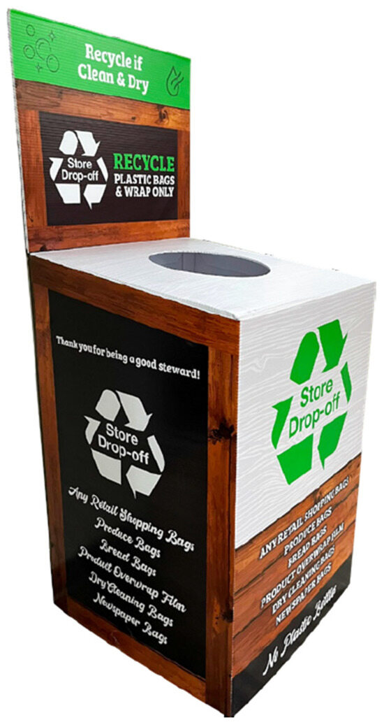 The store drop-off bin measured approximately 24 inches in width and depth, 51 inches in height. Its graphic design consisted of five main elements, including: (a) recycling instructions for the store drop-off bin: “Recycle plastic bags and wraps only”; (b) the contents placed in the bin were required to be “clean and dry”; (c) store drop-off icons; (d) a list of recyclable items; (e) additional text expressing appreciation for people’s efforts to recycle.