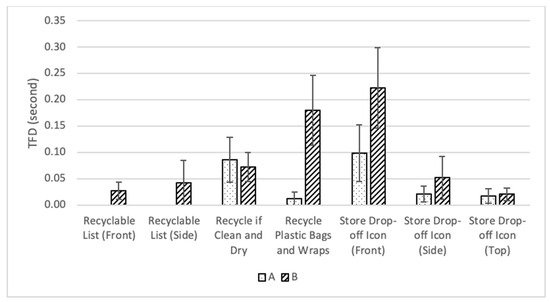In the TFD results, when comparing the group means for the recycling instructions “Recycle plastic bags and wraps” at the store drop-off bin in the statistical analysis (Table 3), Group B was significantly higher than Group A (p = 0.02) at a 95% confidence level. Notably, the store drop-off icon on the front panel captured the longest attention from participants in both groups. Its total fixation duration increased from 0.10 s in Group A to 0.22 s in Group B (Figure 6), with a p-value of 0.20 when comparing group means (Table 4), although the increase was not significant at the 95% confidence level.