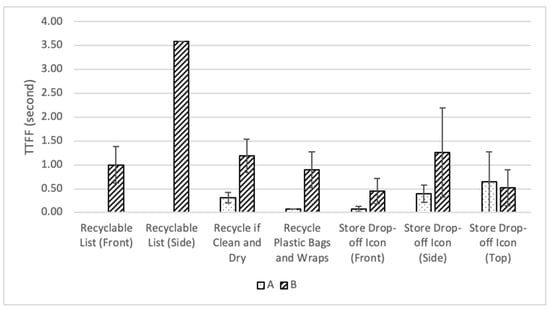 In the TTFF results (Figure 8), it is noteworthy that no data were available for the “recyclable list” element in Group A, neither on the front nor side panels, as none of the participants had viewed them. Conversely, a larger number of individuals observed these elements in Group B. This lack of engagement with the recyclable list indicates a potential gap in awareness or interest among participants in Group A regarding items that can be recycled. In contrast, in Group B, a greater number of individuals observed these elements, indicating a higher level of attention or awareness toward the store drop-off program.