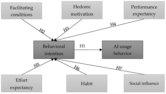 Behavioral intention positively mediates the relationship between performance expectancy, effort expectancy, hedonic motivation, social influence, facilitating conditions, habits, and AI usage behaviors.