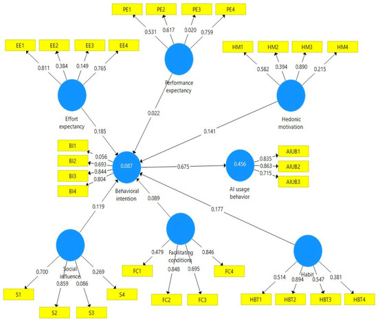 Table 3 presents the results of the factor analysis conducted on the measured constructs. Each row corresponds to a specific construct, including performance expectancy, effort expectancy, social influence, facilitating conditions, hedonic motivation, habit, behavioral intention, and AI usage behavior. The table provides the mean (m) and standard deviation (sd) of the responses, the Cronbach’s alpha (α) coefficient for internal consistency reliability, the percentage of variance explained by each factor, the cumulative percentage of variance explained, the composite reliability (CR), and the average variance extracted (AVE). The results indicate the satisfactory internal consistency of the measurements, as confirmed by the high values of Cronbach’s alpha coefficient (α) for each construct. Additionally, the identified factors explain a significant percentage of variance in responses (ranging from 24.514% to 66.306%), indicating an adequate measurement model.