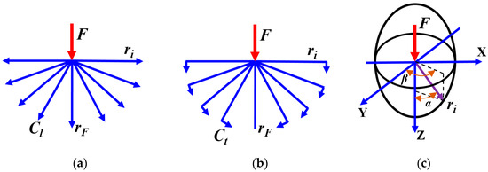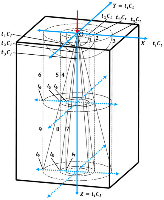Figure 3 shows three-dimensional diagrams of the propagation of elastic waves with longitudinal and transverse waves. A loading diagram of a rectangular object is also shown, with a load applied to its upper face at point O. Pure longitudinal waves propagate in the direction of the load, whereas pure transverse waves propagate perpendicular to it. In all other directions, both types of waves propagate, as shown in Figure 1c and Figure 2.