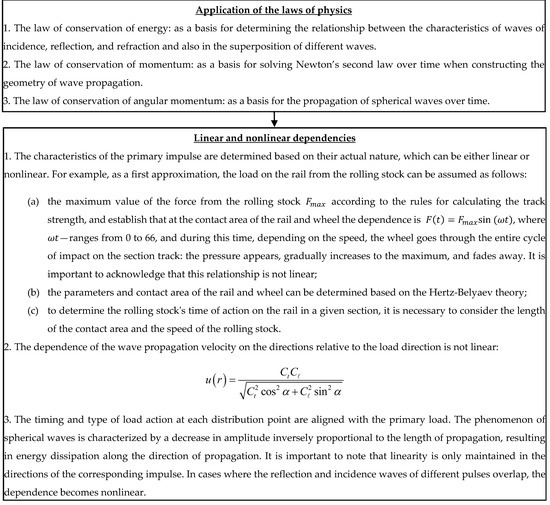 In this case, according to Newton’s second law, during the time of interaction, each contact body (wheel and rail) receives mechanical momentum (momentum as a measure of the quantity of motion) , where characterizes the change in mechanical momentum per unit of time . Thus, during the modeling, all contact areas between all contacting elements will receive an impact impulse subject to the law of change of the impact value over time , characterizing the law of change of impulse over time , the character of which will remain unchanged at its transmission along all directions of energy propagation, which corresponds to the directions of wave propagation. This ability of the impact impulse is confirmed by the human ability to recognize musical pieces acoustically (through the sound carried by elastic waves) and to recognize pieces of art (through the image carried by electromagnetic waves).