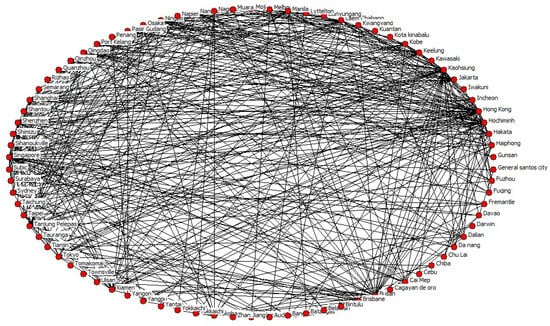 There are two main ways of constructing complex networks: the direct connectivity graph and the complete connectivity graph. The direct connectivity graph is that a port is only connected to neighbouring ports; there is no intermediate port between ports, and only neighbouring ports can be reached, while the view in the complete connectivity graph is that ports can be reached regardless of their proximity, that is, it is possible to start from the port of origin, pass through one or more intermediate ports, and finally arrive at the port of destination. It can be found that the composition of the complete connected diagram coincides with the actual ship navigation situation, that is, the container liner sails between various ports by the established route. In addition, the complete connected graph does not consider the transportation distance between ports and pays more attention to the importance of nodes in the network and the hub role of ports, which is also more conducive to observing the performance change in the whole network after the failure of important nodes. Thus, this section utilises the composition of a complete connected graph to construct a shipping network.