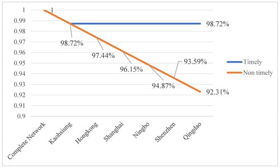Figure 2, the network’s robustness decreases to 98.72% in the case of timely resumption of port operations, while the robustness of the shipping network further decreases when the ports cannot resume operations on time. When all the essential ports in China are out of service, the robustness of the shipping network decreases to 92.31%, which is far lower than that in the case of timely resumption conditions. If the number of suspended ports rises, the robustness of the shipping network is bound to fall further, thus affecting the stability of the network. Thus, we need to minimise the occurrence of multiple ports failing simultaneously and take specific measures to minimise the affected degree of the ports as much as possible to improve the stability of the shipping network.