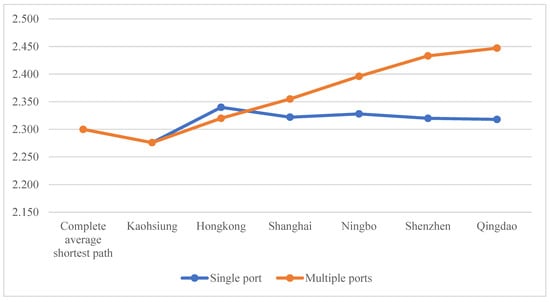 The average shortest path length represents the average of the shortest path lengths between all nodes in the network. In the network, the shorter the average shortest path is, the better the network connectivity and the higher the efficiency; on the contrary, the worse the connectivity and the lower the efficiency. The average shortest path length of the RCEP shipping network obtained through UCINET software is 2.3, which indicates that the goods in the network need to be transferred at least twice to reach the destination port. When the important ports in China are affected by typhoons, the ports’ recovery speed will affect the network’s performance, and the average shortest path will change accordingly. Therefore, in this section, assuming single port failure and multiple port failure, corresponding to the cases that the affected ports have recovered before the subsequent port failure and the affected ports have not recovered before the subsequent port failure, respectively, experiments will be conducted to determine the change in the average shortest path of the network, and the results are shown in