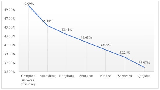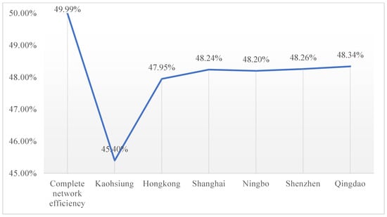 Ef can be obtained by taking the average value of the connectivity efficiency between many nodes. The higher the global network efficiency, the higher the transportation efficiency in the network and the higher the trade efficiency of the network. In this section, the impact of the complete failure of China’s important ports in the network on the global network efficiency is analysed by calculating the global network efficiency, which is shown in Equation (10), where