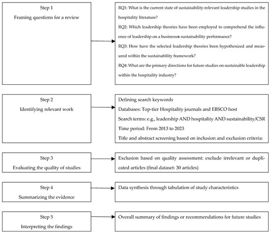 To comprehend the study of sustainability-relevant leadership in hospitality settings, a systematic literature review was carried out, adhering to the five-step approach suggested by Khan et al. [21]: formulating research inquiries, identifying pertinent articles, evaluating article eligibility, summarizing findings, and interpreting the results (Figure 1).