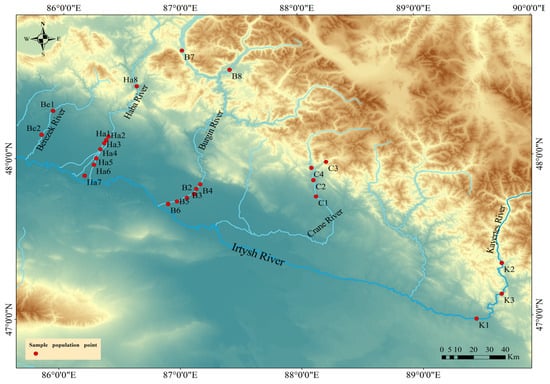 The experimental materials utilized in this study were sourced from the Irtysh River Basin (85°31′–91°04′ E and 46°50′–49°10′ N). The elevation of the basin gradually decreases from southeast to northwest, with an elevation from 4000 m to about 200 m, with an average elevation of 1790 m, and five tributaries from west to east: Berezek River, Haba River, Burgin River, Crane River, and Kayertes River. The water flow of each tributary is oriented from north to south and eventually merges into the main stream of the Irtysh River; it belongs to the mid-temperate continental climate, and the basin enjoys prevailing westerly winds.