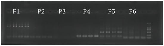 Six microsatellite primers were used for screening (partial samples). P1, P2, P3, P4, P5, P6 represented six primers, and four primers, P1 (ccmp4), P2 (ccmp5), P4 (BCMS1), and P5 (BCMS2), with better amplification results were selected for subsequent tests.