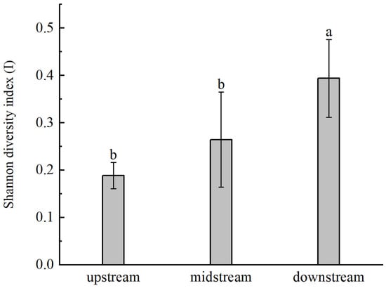 Comparison of genetic diversity among tributaries. Different letters indicate significant differences between groups (upstream, midstream, and downstream) (p < 0.05). Letters a and b indicate significant differences: significant differences between different letters, and no significant differences between the same letters.
