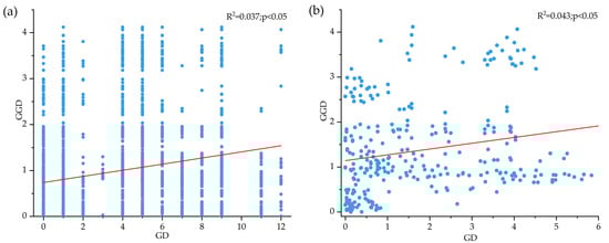 Mantel Test correlation analysis was performed on 198 sample individuals from 25 populations in five tributaries. (a) Correlation analysis of genetic and geographic distances between individuals; (b) correlation analysis of genetic and geographic distances between populations. GD: genetic distance (genetic distance matrix generated in GenAlex software based on chloroplast microsatellite detection data), GGD: geographic distance (geographic distance matrix generated in GenAlex software based on latitude and longitude coordinates).