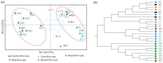 PCA analysis and establishment of UPGAM evolutionary trees based on genetic distance for the B. pendula. (a) is the result of the principal component analysis of B. pendula. Populations from different tributaries are distinguished by different colors of fonts and symbols. The Kayertes River is shown using black fonts and short lines, the Crane River is orange and triangular, the Burgin River is blue and round, the Haba River is green and rectangular, and the Berezek River is red and rhombus. (b) Phylogenetic tree based on Nei’s genetic distance.