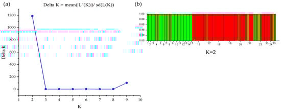 Population STRUCTURE analysis of B. pendula. (a) is the relationship between cluster value K and DeltaK, K ranges from 1 to 10, and the first mutation point on the broken line, that is to say, the best cluster value, is K = 2; (b) is the bar graph of the cluster structure (K = 2) of the 25 populations, with two different colors (red and green) representing different genetic groups, and the horizontal axis is the 25 populations (1–3 are the populations from the Kayertes River, 4–7 are those from the Crane River, 8–15 are those from the Burgin River, 16–23 are those from the Haba River, 24 and 25 are populations of the Berezek River.