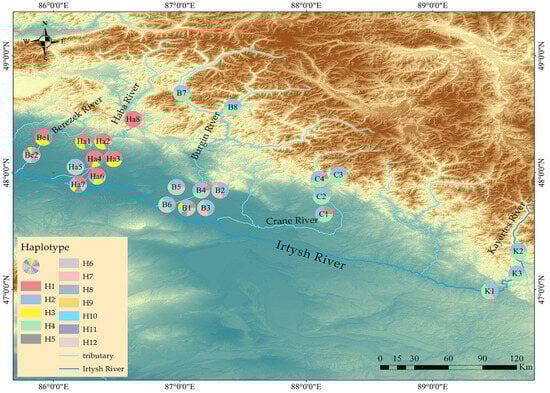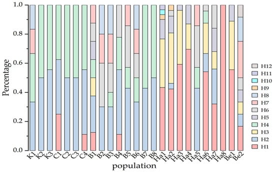 In total, nine alleles were identified across 198 samples, which were grouped into 12 distinct haplotypes. The detailed composition of haplotypes is shown in Appendix A, Table A1. The number of haplotypes varied among the populations, with population Be2 displaying the highest diversity and possessing eight different haplotypes. Based on the haplotype frequency results for each population (Figure 7), haplotypes H2 and H4 were the most prevalent in the Kayertes River, Carne River, and Burgin River populations of B. pendula, whereas haplotypes H1 and H3 were most commonly observed in the Haba River. In contrast to other tributaries, the Berezek River had rich haplotype types and displayed a notably consistent composition. Of the 25 populations, only Ha1 from the Haba River and Be1 from the Berezek River had unique haplotypes, with two unique haplotypes, H10 and H11 for Ha1, and H12 for Be1 (Appendix A, Table A2).