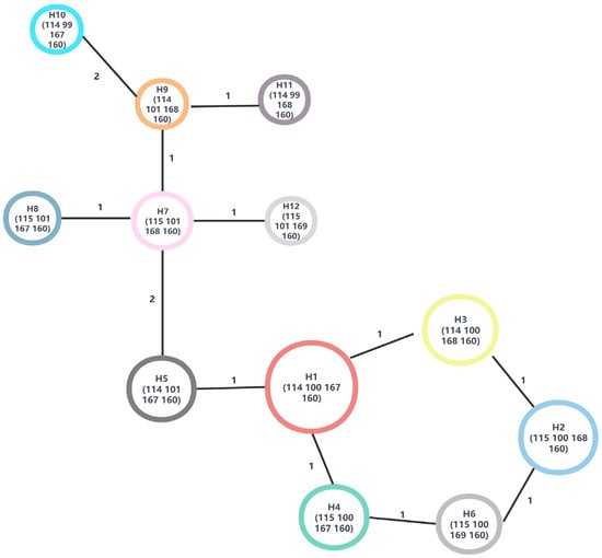 Haplotype network relationship diagram. Each haplotype is represented by a circle of different size and color. The larger circle represents the higher frequency of the haplotype, and the number on the horizontal line represents the number of allelic differences between haplotypes.