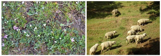 On the other hand, Poa bulbosa pastures are suitable for sheep, but not for cattle and horses, since this type of livestock needs a pasture with a higher biomass and these animals destroy the Poa bulbosa communities due to their heavy weight. These communities are of extraordinary interest for sheep farming and are a source of various ecosystem services, including the dairy industry, with Spain and Portugal being leaders in this type of industry. Poa bulbosa communities are widespread throughout the Mediterranean; they are very suitable communities for sheep due to their palatability and nutritional richness, with a percentage of legumes higher than 50% [41]. Consequently, a form management in which each type of pasture corresponds to a type of livestock is necessary; this would allow for sustainable development.