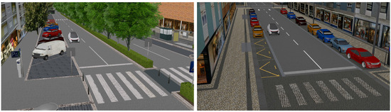 The virtual environments employed in this study were generated using the Blender engine software Version 2.79b (www.blender.org, accessed on 20 February 2024). These environments depicted two real-world urban settings, specifically residential areas featuring buildings and trees positioned on either side of the road (refer to Figure 1). To enhance realism and avoid a sense of emptiness, additional parked vehicles were placed nearby. In both scenarios, traffic consisted of a single vehicle traveling along the outer lane, approaching from the left side of the participant. As indicated by the study conducted by Rodríguez Palmeiro et al. [57], the direction from which the vehicle approached was found to be irrelevant to pedestrian crossing behavior. Each lane of the one-way street within the virtual environments had an approximate width of three meters. Both virtual environments were designed and rendered to offer participants with immersive and realistic experiences, aligning with the specific objectives of the study. To prevent visual monotony and repetitiveness for participants, the assignment of each virtual environment to experimental blocks was randomized before the start of the experiment.