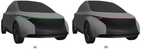 In this study, two distinct eHMI designs were employed, each associated with a different message. The first design featured a green-light band, which was associated with the message “vehicle is yielding”. Conversely, the second design incorporated a red-light band, indicating the message “vehicle is not yielding”. The choice to use these colors was primarily influenced by their familiarity as they are commonly used in traffic lights and have been implemented in previous eHMI designs [1,19].