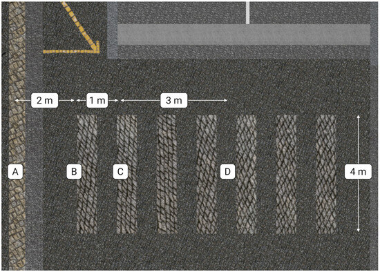 The following is a summary of the elements highlighted in Figure 4: (A) participant starting point: positioned three meters away from the road, this marks the initial position where the participant begins; (B) detection point: located one meter away from the road, this point serves as the location where the participant was detected by the vehicle. For non-decelerating trials, the vehicle proceeds without stopping. In trials with “conditional deceleration”, the vehicle’s behavior depends on its distance to the crosswalk; (C) the crossing point: this represents the section where the participant begins crossing the road; and (D) the end crossing point: this designates the conclusion of the crossing, after which participants return to the starting point for a new trial.