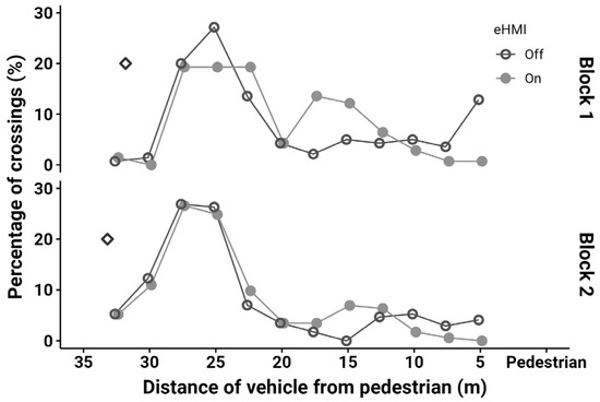 Percentage of crossings (%) for the yielding vehicles in each experimental block as a function of distance of vehicle from pedestrian and eHMI status. The diamond marker indicates the average distance at which the eHMI was activated to the participants. The vehicle always stopped five meters away from the pedestrian.