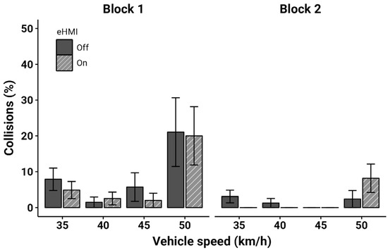 During the experiments, any virtual contact detected between the vehicle and the participant was considered a collision. To ensure participants were aware of these collisions, a sound was played every time the width of the vehicle’s front bumper reached them. The collision rate was determined by dividing the number of collisions by the total number of accepted crossings. This phenomenon exclusively occurred in the non-decelerating trials. Figure 7 illustrates the collision rate divided by experimental block, as a function of vehicle speed and eHMI status.