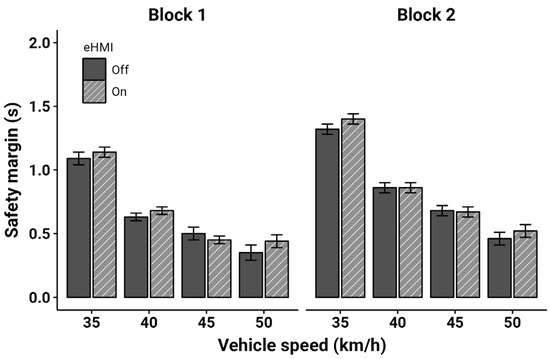 The safety margin was calculated for each crossing in the non-decelerating trials, with the exclusion of the collision data. This metric was determined as the time between the moment the participant passed the path of the approaching vehicle (front end width of the vehicle) and when the vehicle reached the participant’s crossing line. Essentially, it represents the “time left before a collision” during the crossing, as described by Dommes et al. [36]. Figure 8 illustrates the safety margin as a function of vehicle speed and eHMI status and is divided by experimental block.