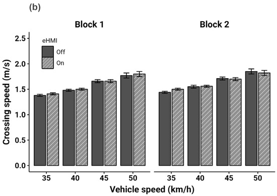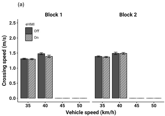 Mean crossing speed (m/s) in each experimental block as a function of vehicle speed and eHMI status (error bars represent standard errors): (a) yielding vehicles; (b) non-yielding vehicles.