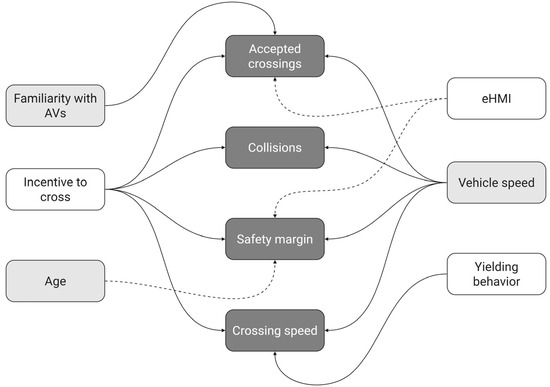 Based on these findings, a new set of experiments should be conducted with a larger and more diverse sample of participants, encompassing a wider range of ages. Emphasizing the role of participants’ age in road-crossing behavior could provide valuable insights into how different age groups react to varying scenarios with AVs on the road. Figure 10 illustrates the outline of the factors that contributed to the change in pedestrian behavior.