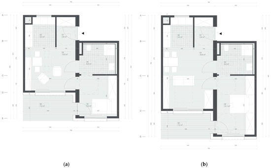 Dwelling unit plans created and evaluated by authors: (a) dwelling unit for one, unit area 39.2 m2 and a balcony of 7 m2; (b) dwelling unit for two, unit area 49.3 m2 and a balcony of 7 m2.