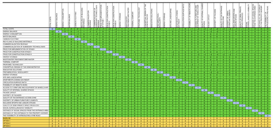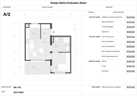 The authors used expert methods to evaluate housing unit modules for repeated use, focusing on modularity/prefabrication, day/night zoning, and wheelchair accessibility to furniture and equipment. When evaluating a design variant, the formal and technical qualities of it were considered. These qualities included appearance, compliance with regulations, functional utility program, ergonomics, and energy efficiency. Based on these, different sets of qualitative characteristics are derived: functional, economic, behavioral and technical. The evaluation involved a checklist of design quality ratings (Figure 4).