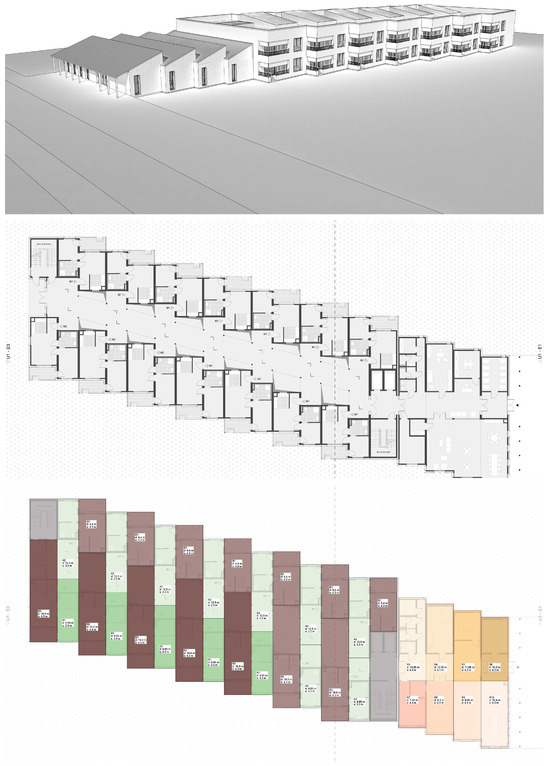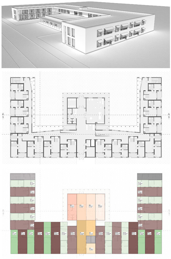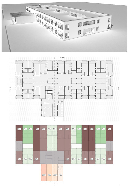 The design team employed a simulation research approach in the project by creating a digital model in a BIM environment [39,40]. They aimed to explore multiple options for the layout of the modules from the beginning, and successive iterations allowed for the evaluation of each variant. Proposed solutions were tested against various quantitative and qualitative criteria, compliance with regulations and standards, and the 3D module prefabrication technology framework. To evaluate a design variant, authors considered its formal (morphological) and technical qualities, such as appearance, compliance with regulations, functional utility program, ergonomics, and energy efficiency (sustainability):