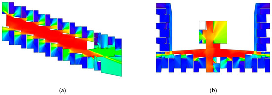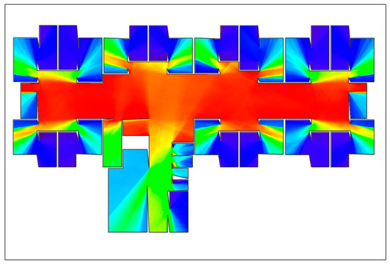 Space Syntax theory was involved in simulating and predicting user behavior in the specific layouts. Linking users’ behavior in space and their social activity to visibility research is based on space syntax and isovist theories, and there is rich and extensive literature on the subject [41,42,43,44,45,46]. The research methodology was applied with the support of computational techniques. To perform high-speed and high-resolution scans of individual floor plans, we used software from the Isovists platform [47]. Clear visualizations of the distribution of measures such as Co-visibility, Choice, and Integration were obtained. A simulation in the Isovists_App program helped to analyze the legibility of room configurations and ease of orientation in the building’s shared spaces. Through the simulation, it was possible to determine the theoretical level of balance between what is seen at a given location and what can be seen through movement from that location. Co-visibility (rV) indicates the degree to which a person at a given site is involved in the reciprocity of “seeing and being seen”.