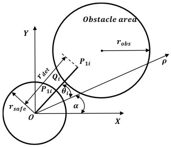 In this function, parameter denotes the radius of the ship safety domain; parameter denotes the length of the detection line segment; and parameter denotes the angle relative to the ship’s course, where . Parameter and parameter are the location parameters of the center point of the obstacle, and parameter is the radius of the obstacle.