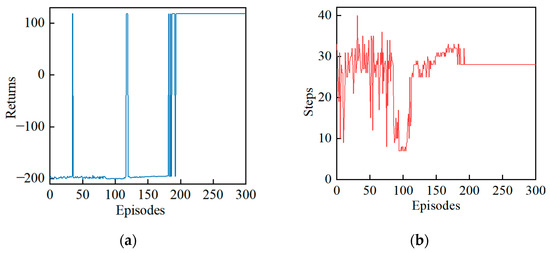To examine the algorithm’s effectiveness throughout the training process, experiments were conducted in an obstacle-free environment. In Figure 2, the horizontal axis represents the number of training episodes, and the vertical axis represents the return and the number of steps, respectively. Figure 3 shows the trajectory changes after different episodes. The return before training was −200, which means that the ship had not yet learned the path-planning strategy, and at this time, the model used randomly initialized parameters. As the algorithm gradually learned the strategy, the model parameters were continuously optimized, and there was some volatility in the return curve.