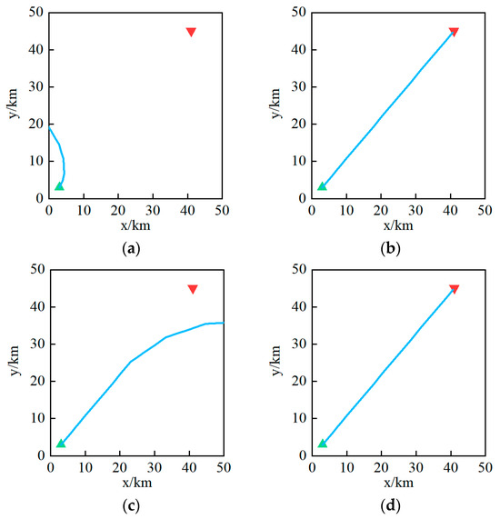 The blue lines represent the ship’s trajectories, while the green triangle indicates the starting point, and the red triangle indicates the target. Experimental results of no-obstacle environment: (a) trajectory after 10 episodes; (b) trajectory after 117 episodes; (c) trajectory after 150 episodes; (d) trajectory after 193 episodes.