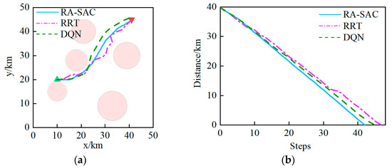 This is because RRT expands paths based on the principle of sampling, which makes it difficult to generate paths with excellent smoothness. In the early stage of path planning, the RRT algorithm approaches the target more quickly, but the superiority of RA-SAC and DQN is quickly reflected in step 8, since the latter two algorithms approach the target more smoothly and faster. To accomplish the same path-planning task, RRT requires the greatest number of steps, and the curve is more volatile, while RA-SAC requires the least number of steps and the curve is smooth with the largest slope, which shows that the improved state space and reward function of RA-SAC are more efficient in directing ship path planning than those of DQN.