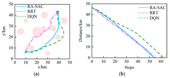 - The effectiveness of the algorithm was verified through simulation experiments, which were measured with the indicator of the path length and the sum of the turning angle. Compared with RRT and DQN, the RA-SAC algorithm showed a superior performance in scenarios of two levels of complexity. Under the environment setting of random start and target points, the success rate of the RA-SAC algorithm path planning was 99.56%, 3.96% higher than that of DQN, indicating that the model has good generalization and robustness.