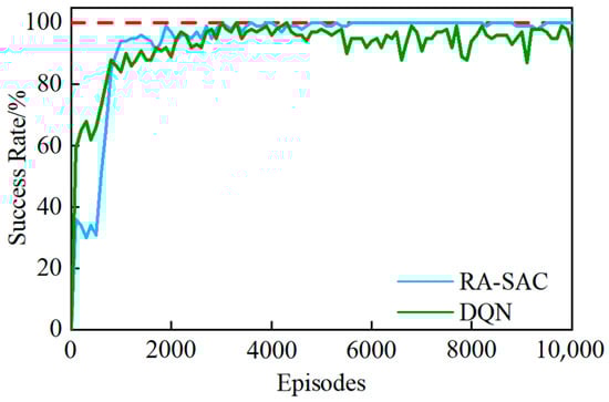 The curve of the success rate changing with the number of iterations is shown in Figure 6, which shows that in the early stage, the success rates of both methods of training tended to increase with the number of iterations, and it can be observed that the performance of DQN improved more rapidly. However, when the number of iterations reached 900, the success rate of RA-SAC exceeded that of DQN, and the curve converged more quickly. In the later stage of training, the curve was smoother and the success rate was close to 100%, indicating that the performance of RA-SAC was more stable.