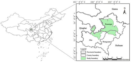 The geographical coordinates of Ruoergai National Park (Sichuan area) range from 101°37′53.650″ E to 103°13′37.304″ E and 32°45′27.811″ N to 33°59′59.063″ N. Situated in the rift basin on the eastern edge of the Qinghai–Tibet Plateau, it is the confluence of the Qinling Mountains, Dieshan Mountains, and Minshan Mountains. The park is located in the northwest region of the Aba Tibetan and Qiang Autonomous Prefecture in Sichuan Province, at the junction between Sichuan, Gansu, and Qinghai Provinces. The study area is in the upper reaches of the Yellow River, administratively affiliated with Ruoergai County, Hongyuan County, and Aba County in Sichuan Province (Figure 1). The total area of the park is 13,829 km2, with the Sichuan area covering 8336 km2. It encompasses six natural reserves of various types, including four nature reserves and two national wetland parks. The park is particularly abundant in wetland resources, accounting for 91% of the swamp wetlands in the Ruoergai area. The landform of the study area consists of denuded hilly plateaus and high plains. The plateau landform is characterized by shallow hills and swamps, with intermittent hills and crisscrossing, winding ravines. These features result in extensive swamps and numerous oxbow lakes. The park is rich in river resources, being part of the Yellow River system, which includes the 174 km main stream of the Sichuan section of the Yellow River and three tributaries: Heihe, Baihe, and Jiaqu.