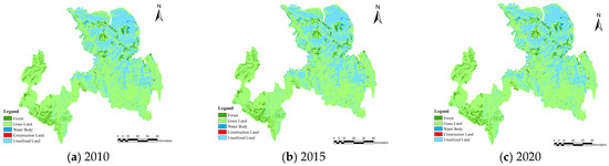 This article presents the land use classification images of Ruoergai National Park for the years 2010, 2015, and 2020. The original data consisted of remote sensing images obtained from the Landsat series data of China Geospatial Data (http://www.gscloud.cn/, accessed on 11 September 2023), with a resolution of 30 m and orbit numbers of 130/37 for all three phases. The process involved two major steps: data preprocessing and supervised classification. Preprocessing included band superposition, radiation calibration, atmospheric correction, and image cropping, all performed using ENVI software. The superimposed image was then radiation calibrated and subjected to atmospheric correction using the Flash module to eliminate errors caused by the remote sensing sensor and atmospheric scattering. Following preprocessing, ENVI’s supervised classification was utilized for the interpretation and classification of the remote sensing images. The classification criteria of image land use type are shown in Table 1. The land in Ruoergai National Park was classified into five major types, construction land, forest, grassland, water area, and unused land, based on the national Grade I land classification standards and field conditions. Land use/cover images were generated from 2010 to 2020 (Figure 2).