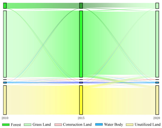 Sankey diagram of landscape transfer in Ruoergai National Park from 2010 to 2020.