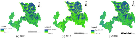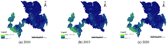 Statistical analysis was conducted on the potential soil erosion amount, actual soil erosion amount, and soil conservation in three periods (2010, 2015, and 2020) in Ruoergai National Park. The overall potential soil erosion amount in these years was calculated to be 7.47 × 105 t, 5.84 × 105 t, and 9.54 × 105 t, respectively. The actual soil erosion amounts were 8.76 × 104 t, 6.79 × 104 t, and 1.14 × 105 t, respectively, while the soil retention amounts were 6.59 × 105 t, 5.16 × 105 t, and 8.40 × 105 t, respectively. Overall (Figure 4), the soil conservation capacity of grassland and unused land with a large area is at a low level, whereas the soil conservation capacity of woodland is at a high level. The total amount of soil conservation showed a trend of first decreasing and then increasing from 2010 to 2020. The soil conservation amount was the highest in 2020, with an increase of 1.81 × 105 t from 2010. Among them, forestland has the highest soil conservation capacity. The decrease in soil conservation capacity in 2015 is attributed to the reduction in forestland area and the expansion of construction land. However, later, in response to various national environmental protection policies, the Ruoergai Wetland was protected and restored, leading to an increase in soil conservation capacity.