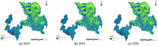 The habitat quality index is a comprehensive measure used to evaluate the quality of habitat based on the land use conditions in the study area [48]. The average habitat quality index in the study area was 0.7036 in 2010, 0.7033 in 2015, and 0.7042 in 2020. The overall habitat quality has been gradually improving and remains generally stable. Figure 7 illustrates that the habitat quality is relatively high in most areas of the study area, particularly in the south and west where there is abundant vegetation and high forest and grass coverage. The central and northern parts of the area also have relatively good habitat quality, mainly due to the extensive coverage of hygrophytes. The improvement in habitat quality from 2010 to 2020 can be attributed to the implementation of various conservation policies and measures, such as large-scale wetland ecological restoration, land desertification control, and water ecological protection and restoration in the study area in recent years.