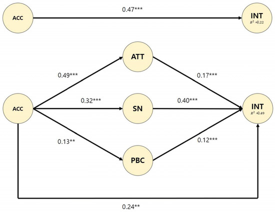 Direct and mediation model with path coefficients. Note 1. Variable labels are as follows: ACC = awareness of climate change, ATT = attitudes, SN = subjective norm, PBC = perceived behavioral control, INT = intention. Note 2. All Statistics represent standardized coefficients for paths. ** p < 0.01, *** p < 0.001.