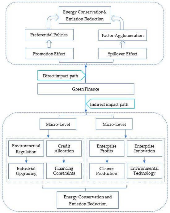 Green finance not only has direct impact mechanisms that affect energy conservation and emission reduction, but it also has rich indirect impact mechanisms, which can be briefly summarized from both macro and micro levels. The indirect transmission mechanism at the macro level includes environmental regulation and credit allocation [58]. The formulation of government environmental regulations depends on the pollutants generated by real economic production activities. The government attaches great importance to the rapid development of the economy. The previous rough development model has caused serious damage to the ecological environment, and environmental pollution and climate change issues have become increasingly severe. It is not sufficient to rely solely on enterprises to shoulder the responsibility of environmental protection spontaneously. Therefore, the government has implemented a series of environmental regulations to solve the pollution emissions generated by production activities and correct the negative externalities they bring. In the context of high-intensity environmental regulation, highly energy-consuming and highly polluting enterprises face serious environmental pressure, with a high demand for green transformation and an urgent need to introduce green production technologies. This process will inevitably increase the governance costs of enterprises in the short term, squeeze out operational investment, and lead to an expansion of the demand for green credit [59]. At this time, green finance provides financing channels for such enterprises for green transformation, thus effectively improving the energy-saving and emission-reduction effects of enterprises.